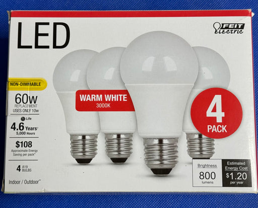 $14.754pk FEIT Electric A19 Bulbs Warm White, 3000K 60W uses only 10W 800 lumens