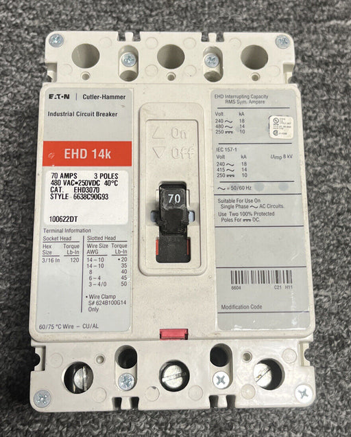$325.00Eaton / Cutler Hammer EHD3070 3 Pole 70 Amp 480V Circuit Breaker